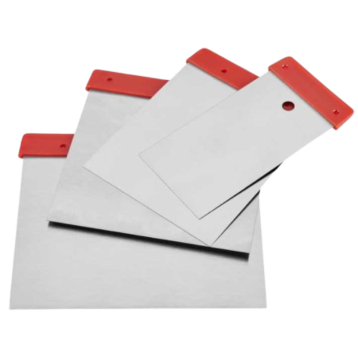 Četru izturīgu tērauda špakteļlāpstiņu komplekts ar plakaniem plastmasas rokturiem, ideāli piemērots špakteles vai pildvielas uzklāšanai un izlīdzināšanai.